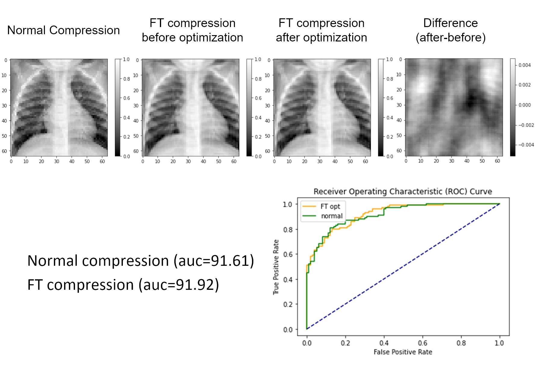 This project proposed a Fourier-transform-based (FT-based) image compression filter for Chest X-ray images in the Deep Learning training to distinguish normal and pneumonia images. The FT filter was initialized with a Butterworth low-pass filter, and was optimized during network training of a reduced ResNet. The resulting FT compression layer could compress images to 1/4 of their original sizes and slightly improve prediction AUC. Please refer to the following links for more information about this project. |