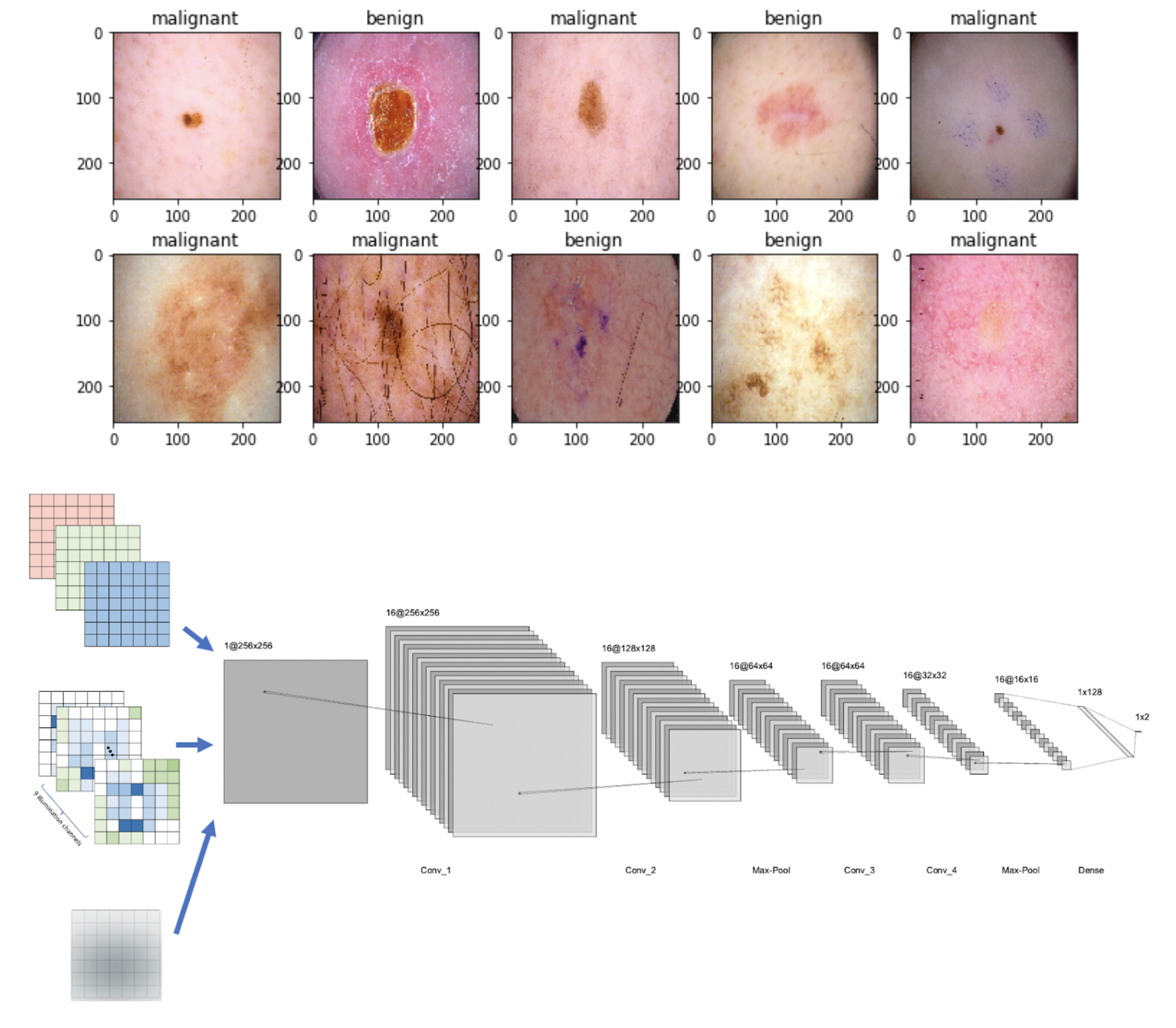 Skin cancer is the most prevalent type of cancer, and can be deadly if left untreated. In recent years, deep learning approaches have been implemented to automate skin cancer detection and classification using dermoscopic images, however, the process still requires human intervention to capture accurate and high quality dermoscopic images. This study aims to automate the physical components of the dermoscope to see if optimizing for these components will increase model performance results. After optimizing for the color channels, illumination patterns, and lens blur with a convolutional neural network (CNN), the results suggest training the lens blur with the CNN improves classification performance, from 0.70 AUC and 70% accuracy to 0.73 AUC and 74% accuracy. This study can be extended to a larger aim of creating inexpensive, portable and fully automated imaging systems to detect skin cancer. |