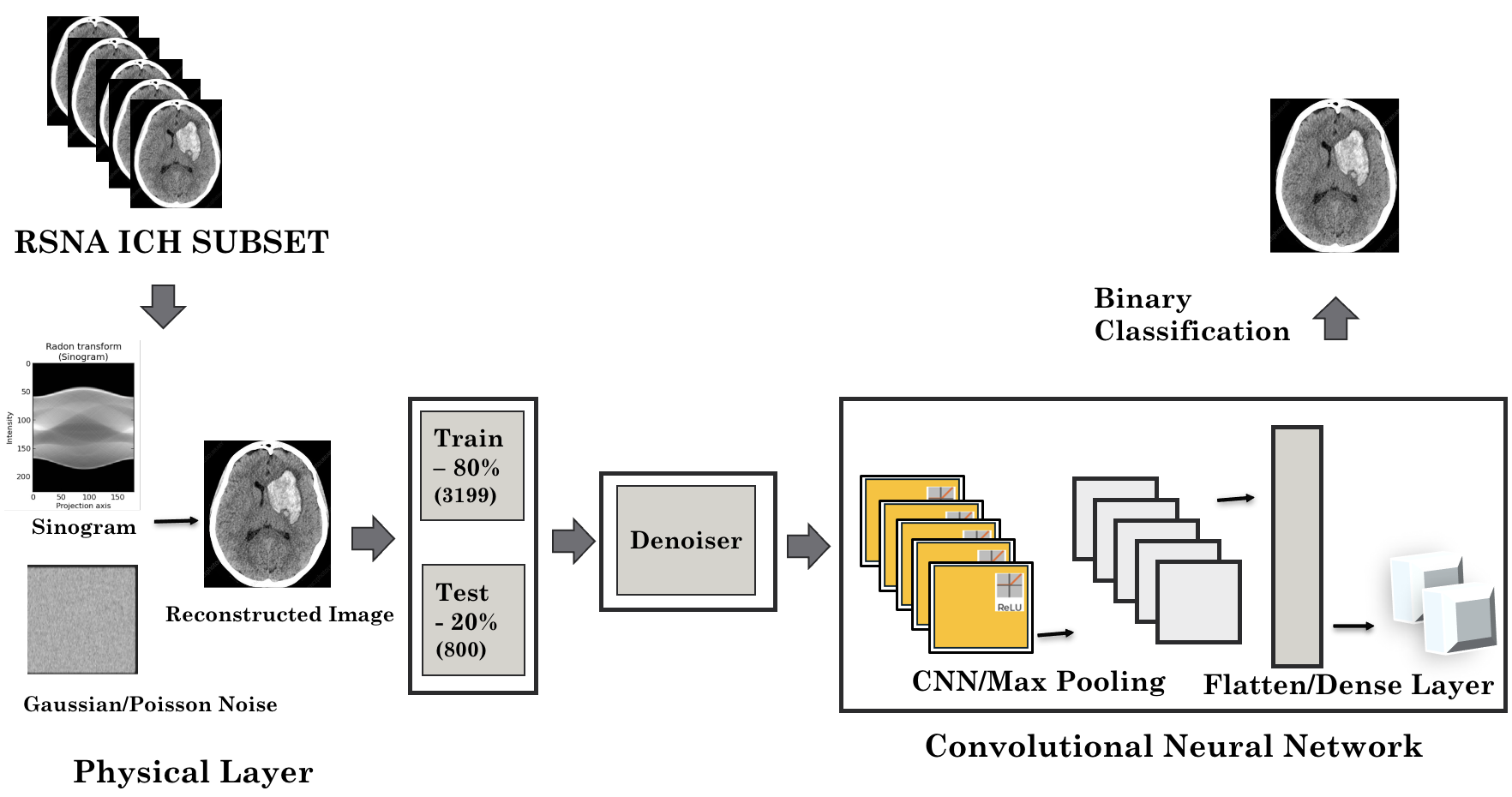 CT images are affected by multiple physical like sensor noise, temperature (thermal/Johnson-Nyquist noise), electrical charges, background radiation, and photon counting. In this study, we simulate CT noise by applying Gaussian and Poisson noise to the sinogram of CT Scans and utilize the reconstructed images to detect Intracranial Hemorrhage (ICH) using the publicly available RSNA dataset. Our results show that a physics-informed VGG pipeline can perform effectively with simulated noise.