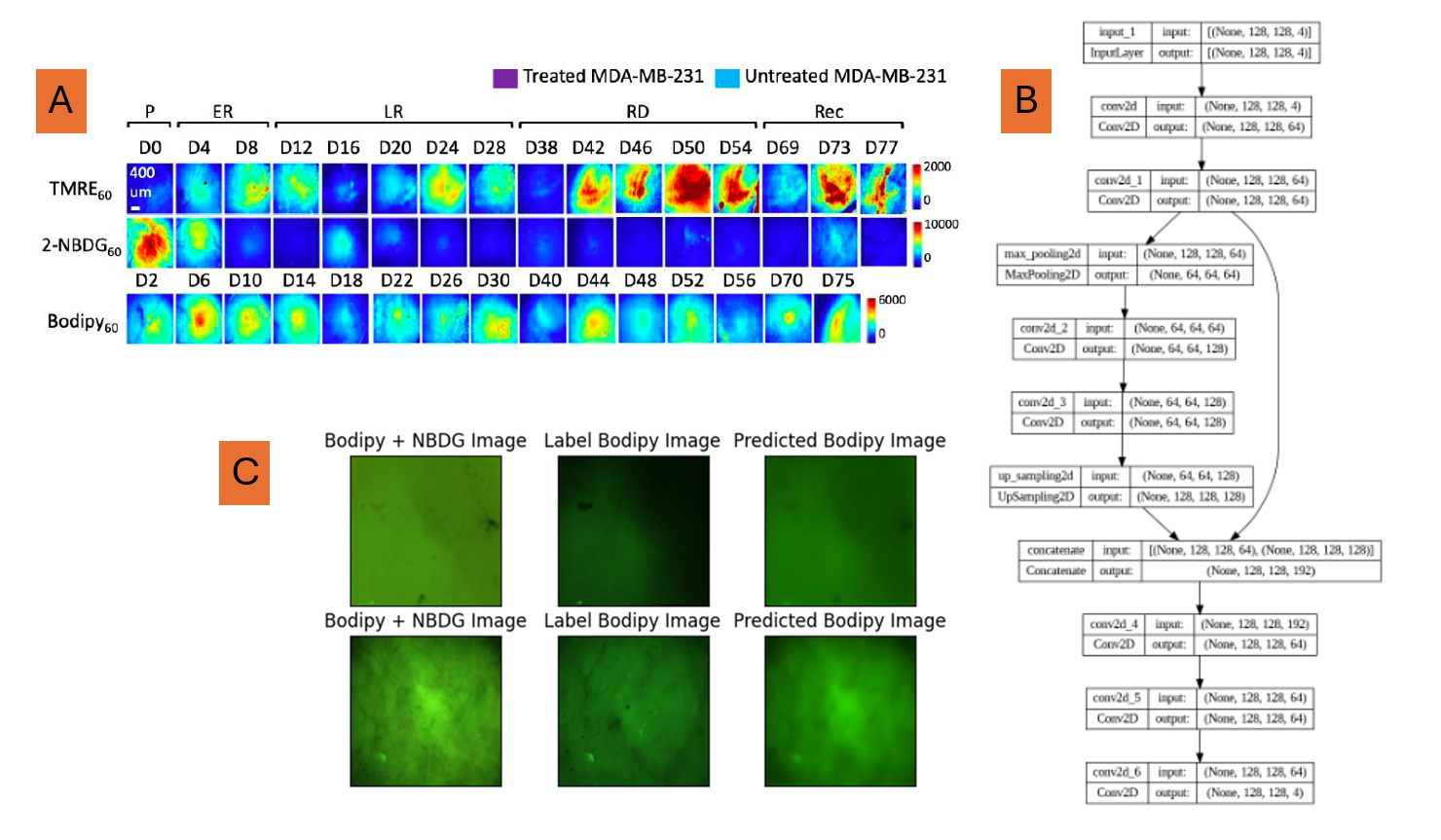 Breast cancer is the most common cancer in women worldwide; the most aggressive form of triple negative breast cancer lacks many hormone receptors making tracking this overall disease and tumor molecular subpopulations. Our lab has developed an optical toolkit of three fluorophores to measure metabolic changes over time. Given the optical crosstalk of some of our fluorophores, our goal was to be able to image metabolic features simultaneously in vivo, therefore needing unmixing capabilities, which we hope to achieve with a convolutional neural network model. We used different combinations of our simulated RGB images to perform several experiments of unmixing two or three channels. We found that more distinct channels (green and red) gave better results than overlapping channels (green and green). Landmark features were visually observed but at a lower resolution and contrast than the true labels. We believe more reliable results can be achieved with more structural and optical information. The figure shows (A) the raw data collected by Sunassee ED, (B) the modified U-Net architecture used in the project, and (C) the results of the network trained on Bodipy and 2-NBDG mixed into an RGB image and with Bodipy as a label.